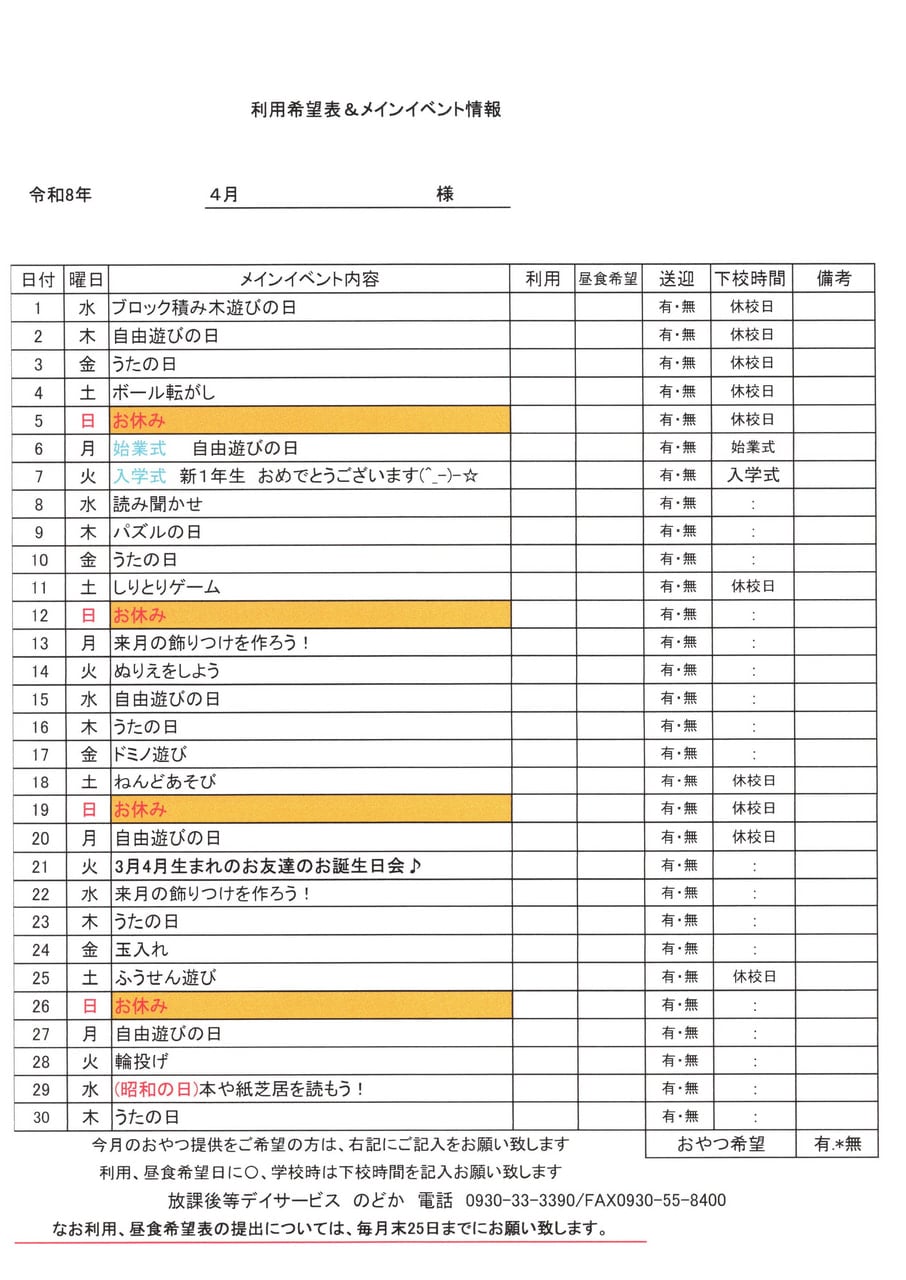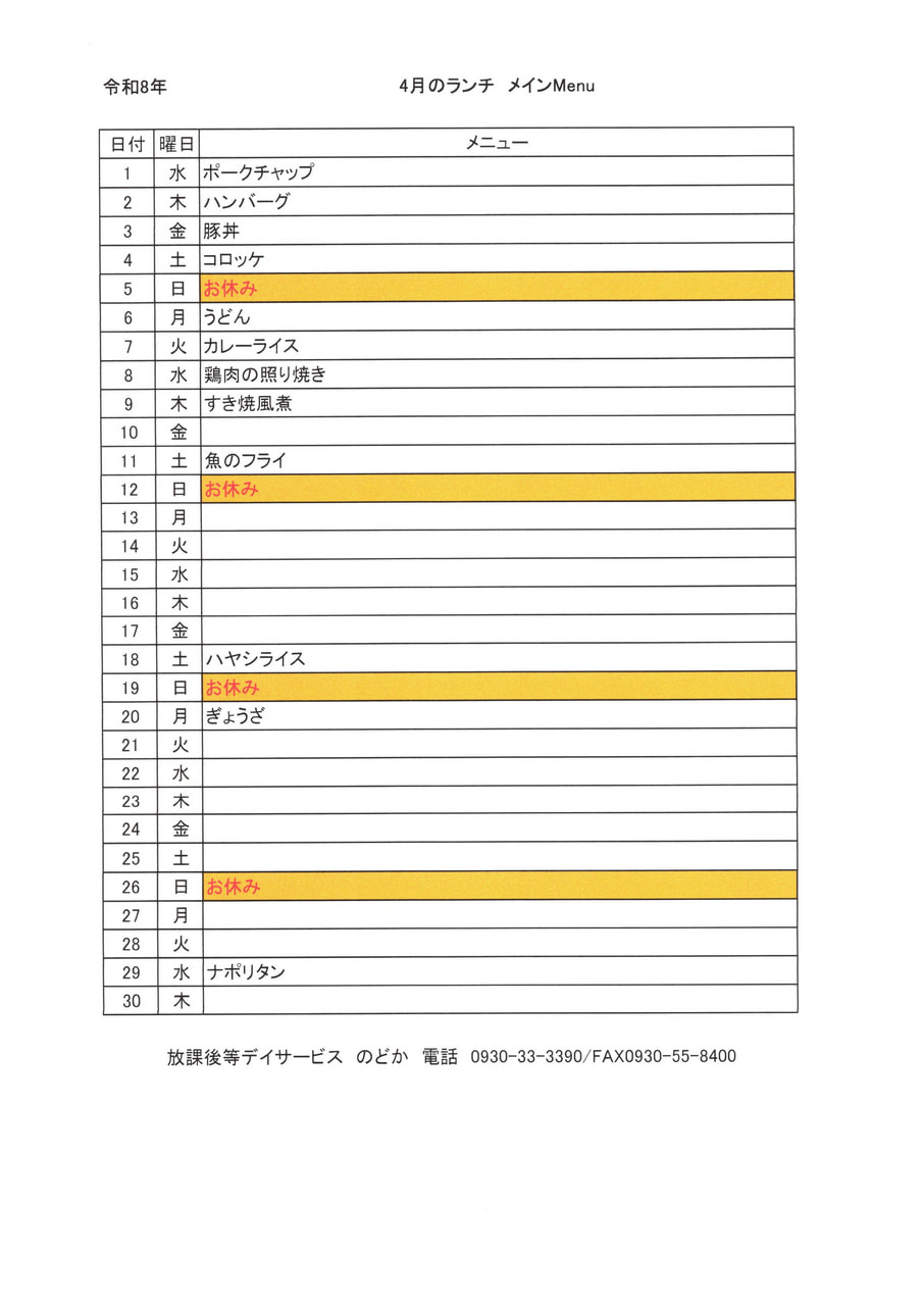 2026年4月 イベントとランチメニュー